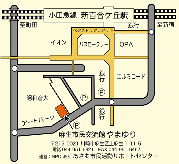 小田急線 新百合ヶ丘駅から数分の「麻生市民交流会館やまゆり」です。